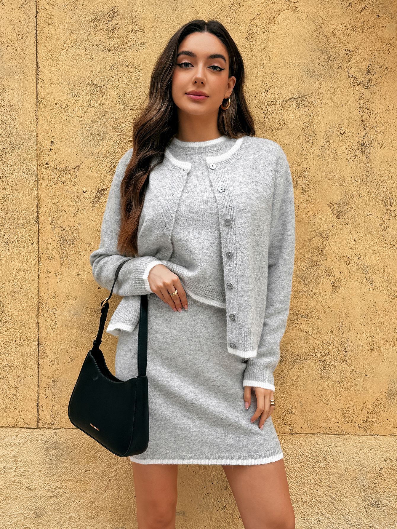 Cardiganul gri pentru femei este un must-have în orice garderobă, emanând o atmosferă elegantă și rafinată. Acest outfit realizat cu grijă include un cardigan stilat, un tricou fără mâneci multifuncțional și o fustă din tricot la modă, toate fiind concepute pentru a se potrivi perfect. Nuanța moale de gri a cardiganului adaugă o tentă de culoare neutră, făcându-l o alegere ideală pentru femeile care apreciază stilurile clasice și urmăresc confortul, permițând ușor de combinat cu diverse articole vestimentare.